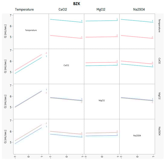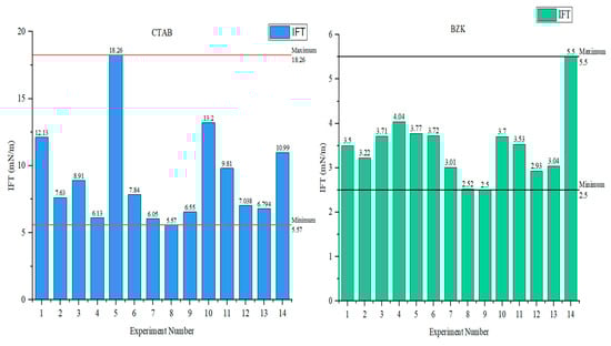 Experiment 9, which recorded one of the two lowest IFTs, was a central run with medium concentrations of Mg2+, Ca2+, and SO42− ions. On the contrary, the maximum IFT value is 5.5 mN/m, and this was recorded in Experiment 14 with low Ca2+ and Mg2+ ions and high sulfate ion concentrations at ambient temperature. The same trend was observed in the literature, emphasizing the role of divalent ions on the IFT value in the presence of CO2 [44]. Overall, the average IFT values for BZK for all the experiments were lower compared to those obtained for CTAB. Thus, BZK showed a better performance and lower IFT compared to CTAB under similar ionic conditions, and the results seem consistent with values between 3 and 4 mN/m, as can be seen from most of the experiments, except in Experiment 9, with the highest value of 5.5 mN/m.