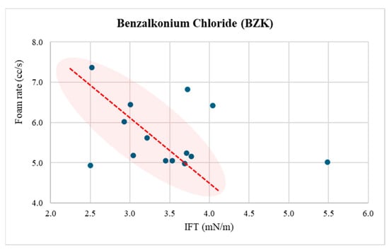 Foam generation and interfacial tension (IFT) are closely interconnected concepts in surface chemistry. This analysis was conducted to explore the relationship between IFT and foam generation rate (foam volume/time). The experimental results, illustrated in Figure 15, generally demonstrate an inverse correlation where lower IFT values are associated with higher foam generation rates. While this general trend is evident, the data also display a degree of variability, with several outlier points that deviate from the expected pattern. These outliers highlight the organic nature of the experimental data that reflects the inherent complexity of interfacial phenomena and the dynamic behavior of foam systems. It is important to note that such deviations are not uncommon in surface chemistry studies, where multiple factors can influence the results, such as temperature variation, surfactant concentrations, measurement errors, or even microscopic impurities. These outliers may also stem from minor experimental errors or limitations in the measurement techniques, which could affect the consistency of both IFT values and foam volume quantification. Despite these outliers, BZK and CTAB were studied in detail. The amphiphilic structure of BZK allows it to readily adsorb at the CO2–brine interface, effectively reducing interfacial tension. As shown in Figure 15, BZK consistently produced more foam under lower IFT conditions. This is likely due to CO2’s solubility in the brine phase, which can influence the structural characteristics of the interfacial film formed by BZK. The reduced IFT enhances BZK’s ability to stabilize foam by enabling the formation of smaller, more persistent bubbles, even in the presence of experimental variability.