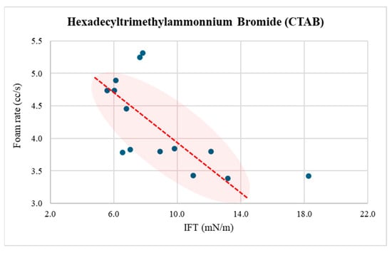 CTAB also demonstrates significant effects on interfacial tension. The interaction of CO2 with CTAB leads to a reduction in IFT, like BZK, as CO2 effectively alters the properties of the brine phase, further promoting foam formation. Figure 16 illustrates a similar trend for CTAB, where higher foam volumes were generally observed at lower IFT values. However, as with BZK, the data points for CTAB also include a few noticeable outliers.