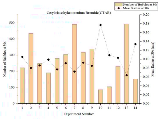 The analysis for CTAB reveals a fluctuating trend in both the number of bubbles and the mean bubble radius across different experiments. The number of bubbles varies significantly, with the highest bubble number observed in Experiments 7 and 13, with a number of bubbles of about 500, while the lowest occurs in Experiments 10 and 11. Similarly, the mean bubble radius demonstrates notable fluctuations, peaking at approximately 0.18 mm in Experiment 10 and reaching its lowest value of about 0.06 mm in Experiment 13. This variation suggests that different experimental conditions or surfactant interactions may be influencing bubble formation and stability.