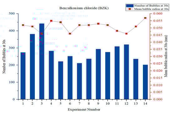 BZK also shows a similar trend with bubble size and radius, but with a relatively small mean radius ranging from 0.046 to 0.057 mm in Figure 18.