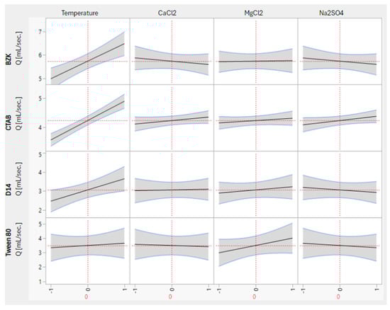The effect of temperature and salinity on the performance of the examined surfactants was analyzed using p-values generated from statistical tests. Table 4 and Figure 19 indicate that temperature has the greatest influence by showing statistical significance on p-values of 0.0012, <0.0001, and 0.0176 for BZK, CTAB, and D14, respectively. However, there is not enough statistical evidence shown for the temperature on Tween 80. Clearly, cationic CO2-switchable surfactants are more sensitive to thermal changes compared to conventional surfactants. The higher responsiveness of BZK and CTAB to temperature may be attributed to thermodynamically driven alterations in surface activity and micelle formation. On the other hand, CaCl2, MgCl2, and Na2SO4 showed no statistically significant influence across most surfactants. However, Na2SO4 displayed a borderline effect on CTAB with a p-value of 0.0895, which can be attributed to ionic interactions with cationic head groups. Tween 80, a baseline, showed the least responsiveness to any factor, as expected, due to its inert behavior under changes in conditions. This supports the CO2-switchable surfactants’ desired responsiveness for the earlier-mentioned applications. Generally, BZK and CTAB are suitable in temperature-dependent, stimuli-responsive systems while D14 poses a moderate alternative.