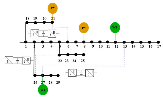 The simulation is based on a 29-bus distribution system from a specific region, as shown in Figure 2. In this system, photovoltaic (PV) units are connected to buses 8 and 21, with capacities of 480 kW and 350 kW, respectively. Wind power units are connected to buses 12 and 27, with capacities of 300 kW and 450 kW. Both PV and wind generation operate with a constant power factor, set to 0.95.