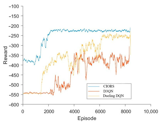 As shown in Figure 3, to verify the solution efficiency and effectiveness of the proposed method, convergence curves of the algorithm training process under identical parameter settings were plotted. During training, the CIORS algorithm demonstrated a faster convergence rate compared to Dueling DQN, owing to the introduction of a prioritized experience replay mechanism, while the convergence performance of the DQN algorithm was relatively inferior. Moreover, the reward function of the proposed method converged to a higher value than that of Dueling DQN, indicating that the resulting optimized strategy is more effective in guiding the distribution network to operate in a safer, more economical, and cleaner manner.