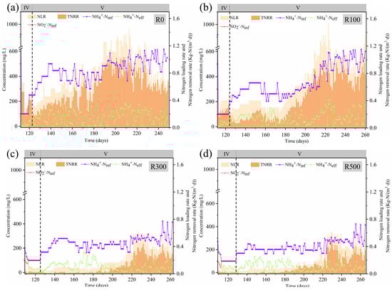 Nitrogen Loading Rate, Total Nitrogen Removal Rate, and changes in NH4+-Ninf and NH4+-Neff concentrations for the recovery phase in R0 (a), R100 (b), R300 (c), and R500 (d).