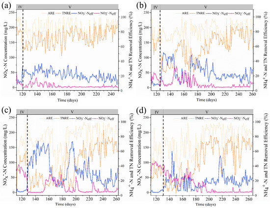 NO2−Neff, NO3−-Neff, ammonium removal efficiency and TN removal efficiency of R0 (a), R100 (b), R300 (c), and R500 (d) during the recovery phase.