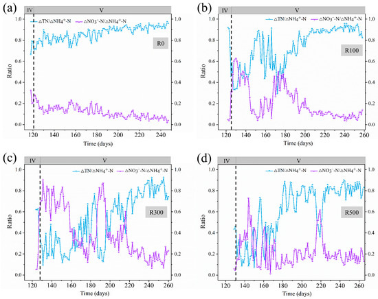 Stoichiometry ratio of R0 (a), R100 (b), R300 (c), and R500 (d) during the recovery phase of the system.