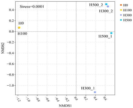 Non-metric multidimensional scaling (NMDS) analysis was performed to assess beta-diversity differences among communities during recovery (Figure 4, Stress = 0.0001). H0_45 and H100_60 clustered closely, suggesting minimal community divergence. In contrast, H300_1/H300_2 and H500_1/H500_2 exhibited significant spatial separation, indicating distinct microbial community structures in R300 and R500 at different recovery phases (Day 60 vs. Day 120) [21]. The divergent trajectories of R300/R500 communities (H300_2 and H500_2) further corroborated the delayed TNRE recovery observed between Days 100–120 (57.98–58.86%).
