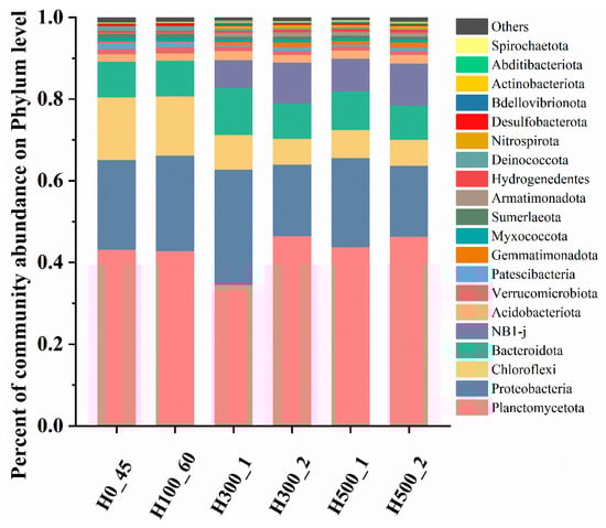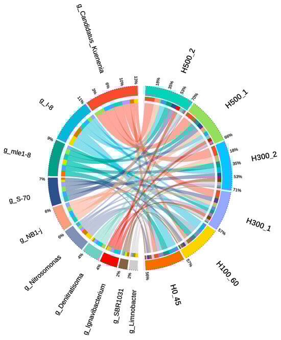 A total of 40 phyla were detected across six samples, with 9 phyla exhibiting relative abundances > 1% (Figure 5). In R0 and R100, the dominant phyla were Planctomycetota, Proteobacteria, Bacteroidota, and Chloroflexi. Planctomycetota encompasses all known AnAOB, including Candidatus_Brocadia and Candidatus_Kuenenia [22], serving as core functional taxa in Anammox systems by directly mediating the anaerobic oxidation of ammonium and nitrite. Proteobacteria includes diverse nitrogen-cycling genera such as Nitrosomonas (key ammonia oxidizers) [23] and heterotrophic denitrifiers (Thauera, Limnobacter, Pseudomonas) [24,25].