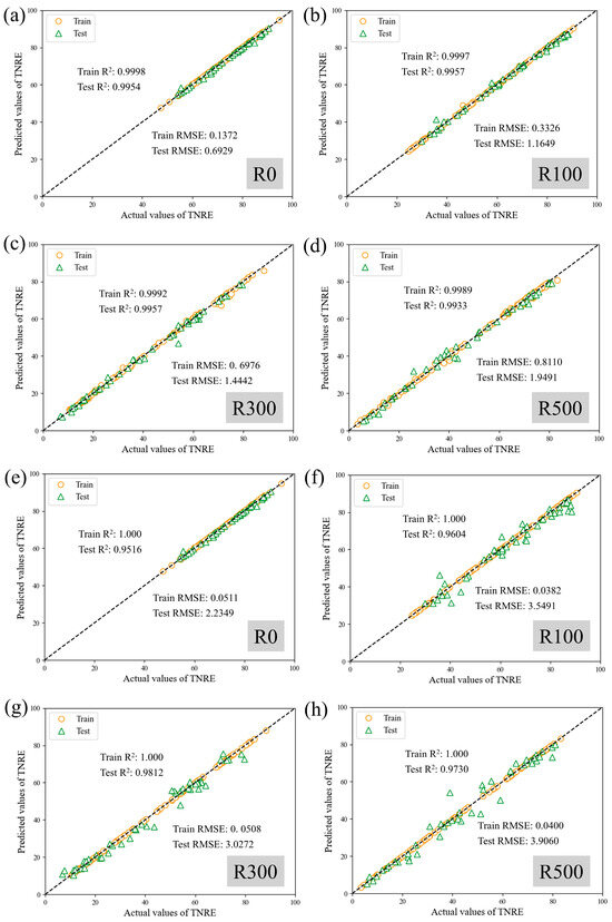 Comparison of prediction results for Total Nitrogen Removal Efficiency (TNRE) in the CANON system (R0, R100, R300, R500) using Support Vector Regression (a–d) and Extreme Gradient Boosting Models (e–h).