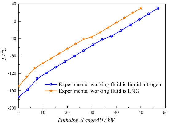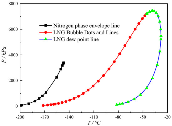 As shown in Figure 1 and Figure 2, the phase envelopes of natural gas and nitrogen, as well as the heat transfer curves for nitrogen and natural gas as the experimental working fluids, are presented. Figure 1 and Figure 2 were generated using HYSYS V.14 software, a widely utilized process simulation tool in the field of chemical engineering. HYSYS offers a comprehensive suite of thermodynamic models and utilities for calculating the physical properties and phase behavior of substances. The phase envelope diagrams were created using the Peng–Robinson equation as the thermodynamic model to compute the fluid’s phase behavior. This involved inputting essential fluid properties, such as composition and pressure, and calculating phase equilibrium data at various temperatures and pressures. Additionally, HYSYS can provide temperature and enthalpy data under different working conditions, which can be used to construct corresponding plots.