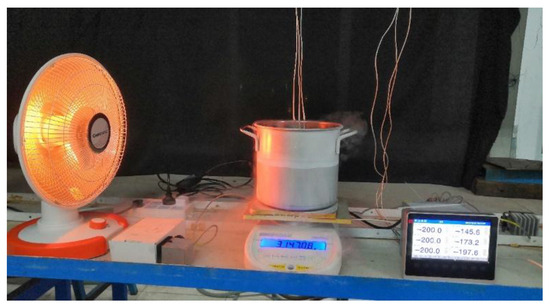 Figure 3 shows the physical image of the liquid nitrogen evaporation test system, which includes the following main equipment: electric heater (radiation source), thermal radiation sensor, liquid nitrogen tank, mass scale, paperless recorder, PT100 thermistor, and laptop. Among them, the liquid nitrogen tank selected in the experiment has a diameter of 20 cm, a height of 20 cm, and is made of stainless steel with a wall thickness of 0.2 cm; the maximum power of the selected electric heater (radiation source) is 990 W. In this study, the thermal radiation sensor employed is the TS-30 type radiative heat flux sensor manufactured by Captec, Lille, France. It is used to measure the radiative heat flux transmitted from the electric heater (radiation source) to the front surface of the liquid nitrogen container. Weighing is the most commonly used, direct, and reliable method for investigating the evaporation characteristics of cryogenic storage tanks. During the experiment, an NBL-6202e-type mass scale was utilized to measure the weight. Data were collected and recorded in real time every 30 s via a laptop computer.
