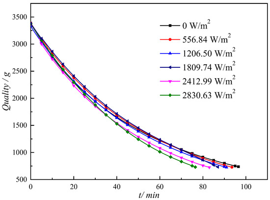 Figure 5 illustrates the mass variation of the experimental system with time under the influence of radiation. The termination of the experiment is marked by the complete evaporation of liquid nitrogen, that is, when the liquid quantity inside the liquid nitrogen container reaches zero. As can be seen from the figure, under different radiation conditions, the overall mass reduction trend of the liquid nitrogen evaporation system is consistent, which means that as time progresses, the rate of mass decrease gradually slows down. The reasons for the deceleration of mass reduction include (1) the increasing accumulation of frost on the surface of the liquid nitrogen container, which diminishes the accuracy of the measurement outcomes, and (2) the surrounding temperature field of the liquid nitrogen container cooling to a certain extent, thereby slowing the rate at which environmental heat enters the container.