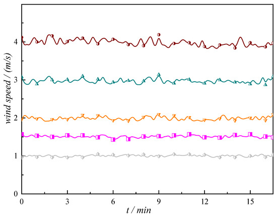 (1) Open the wind tunnel test section viewport, connect and debug the mass balance and laptop, and zero the mass balance. (2) Arrange, test, and accurately position the wind speed sensor, paperless recorder, and three PT100 thermistors. Begin data acquisition and observe whether the wind speed measurement is stably at 0. (3) Close the wind tunnel test section viewport, start the wind tunnel fan, and adjust the test wind speed. (4) Open the wind tunnel test section viewport again, quickly pour a certain amount of liquid nitrogen into the liquid nitrogen bucket, and then quickly place it on the mass balance. Record this moment as the start time of the test. Close the wind tunnel test section viewport and begin the test. (5) During the test, six sets of experiments are conducted by changing the wind speed in step 3 to 0, 1, 1.5, 2, 3, and 4 m/s, respectively. The temperature during the test is maintained at 12 °C. The experimental wind speeds for each group are shown in Figure 6.