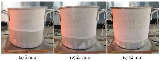 Figure 7 shows the surface of the liquid nitrogen tank at the moments of 5 min, 21 min, and 42 min during the process with a wind speed of 1.5 m/s. Compared with Figure 7, it can be seen that the liquid nitrogen tank has less frost on its surface under the influence of wind. Moreover, there is a distinct boundary line on the surface of the liquid nitrogen tank, which reflects the liquid level inside the tank. The reasons are as follows: (1) the wind reduces the sublimation and accumulation of water vapor in the air, leading to a decrease in the amount of frost; (2) the wind disrupts the temperature field around the liquid nitrogen tank, keeping the temperature of the tank wall at a very low level.