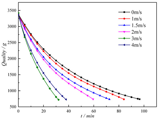 Figure 8 illustrates the variation of the mass of the experimental system over time under different wind conditions. It is evident from the figure that wind has a significant impact on the evaporation rate of liquid nitrogen. The greater the wind speed, the more rapidly the mass of the liquid nitrogen tank system decreases. This is primarily because an increase in wind speed enhances the convective heat transfer coefficient outside the low-temperature storage tank, thereby greatly increasing the amount of ambient heat entering the liquid nitrogen tank. Table 2 presents the time required for liquid nitrogen evaporation tests under various wind conditions.