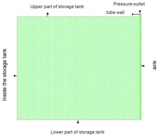 The partitioning of computational domain grids is a pivotal step in numerical simulation analysis. The quality of the grids directly influences the outcomes of the simulation. High-quality grids are often capable of significantly reducing simulation time while enhancing both computational efficiency and accuracy. Given the axisymmetric nature of the storage tank’s calculation domain depicted in Figure 10, a two-dimensional structured grid is generated using half of the calculation domain. This grid is composed of quadrilateral elements, which offer high resolution and excellent convergence properties.