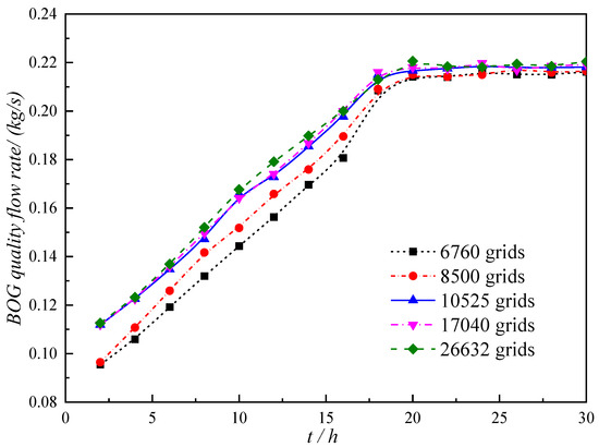 Transient mass flow rate of BOG in 30 h under different grid divisions.