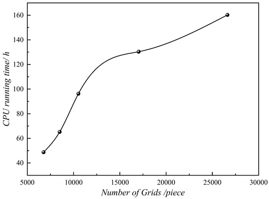 In this study, a simulated evaporation time of 30 h was employed as a benchmark for numerically calculating the BOG outlet flow rate. Independence tests were carried out using five distinct grid counts: 6760, 8500, 10,525, 17,040, and 26,632 grids. As depicted in Figure 12, the transient mass flow rate at the BOG outlet exhibits significant variation in the initial phase due to differences in grid size. However, after 18 h of simulation, the results converge to nearly identical values. For instance, the difference in BOG transient mass flow rate between the 10,525 and 17,040 grid counts is less than 0.61%. Figure 13 provides a comparison of the CPU computation time required for simulating a 30 h evaporation period in LNG storage tanks.
