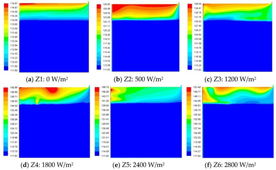 As depicted in the figure, as external fire radiation intensifies, the maximum temperature of the upper gas space within the storage tank progressively rises, and the temperature field gradually shifts from a uniform stratification to a more disordered stratification. This transformation occurs because increased external radiation allows more ambient heat to enter the storage tank. Consequently, the rate of liquid evaporation at the gas-liquid interface accelerates, generating a larger volume of gas that disrupts the previously stable temperature field.