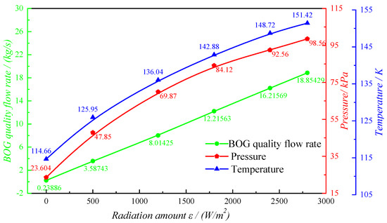 Taking external radiation as the independent variable, the stable BOG mass flow rate, along with the upper gas temperature and pressure data of the storage tank, have been systematically organized and are presented in Figure 15.