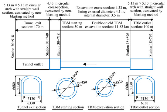 The water delivery tunnel of the West Route for Anyang City is a diversion of the South-to-North Water Diversion Project, which runs across hilly terrain with a total length of 13.18 km. The project includes several sections, including the TBM excavation tunnel, TBM launch, TBM exit, and tunnel outlet sections, as shown in Figure 1, for the overall layout of the tunnel. Among them, the TBM excavation section has a total length of 11.82 km with a gradient of 0.01%. The tunnel cross-section is circular with an excavation diameter of 4.33 m and a designed cross-sectional diameter of 3.5 m. Each ring was constructed using four hexagonal honeycomb segments, each 0.3 m thick, arranged in a staggered seam pattern [6,7]. The gaps between the segments and the surrounding rock were filled with pea-gravel grouting, and unpressurized gravity water flow was delivered inside the tunnel.