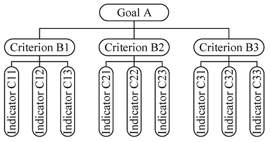 When the AHP is used to address decision-making problems, an indicator system should be established based on the actual situation of the problem. A structural model for the AHP should be constructed that consists of the goal, criteria, and indicator layers [40], as shown in Figure 2.