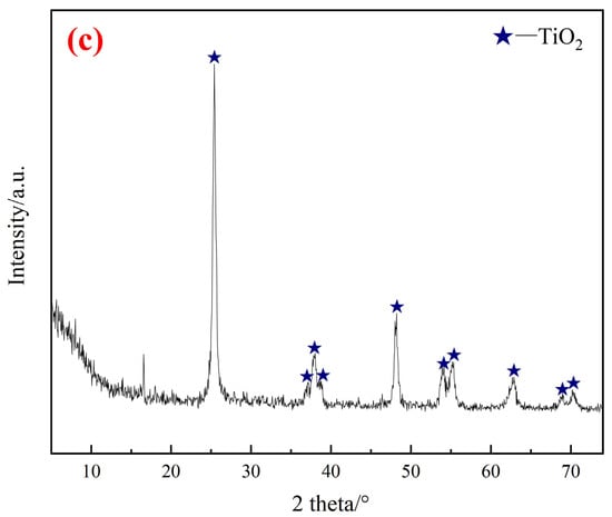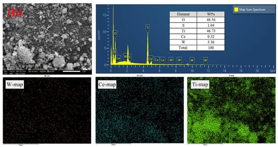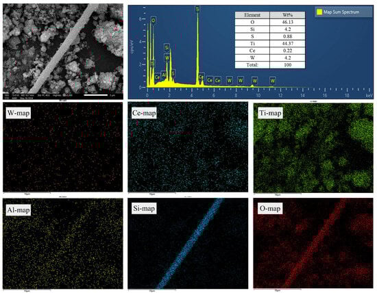 The spent W-Ce/TiO2 SCR catalysts were supplied by a smelter in Ganzhou, Jiangxi, China. The main compositions of spent SCR catalysts are listed in Table 2. The morphology of solid samples was examined using SEM. As shown in Figure 1a, the surface of spent SCR catalyst raw materials was relatively smooth, with the presence of small pores, together with some rod-like grains. According to the EDS analyses in Figure 1b, the main component elements of the catalyst are Ti, W, and Ce, uniformly distributed in the catalyst. The embedded rod-like grains were glass fibers, mainly composed of SiO2 and Al2O3. The phase composition was determined using XRD, and the results are shown in Figure 1c. The main component of the catalyst was TiO2. There was a small peak between 15° and 20°, which could not be attributed to a certain phase. The substances such as SiO2, WO3 or CeO2 might exist in an amorphous or microcrystalline form.