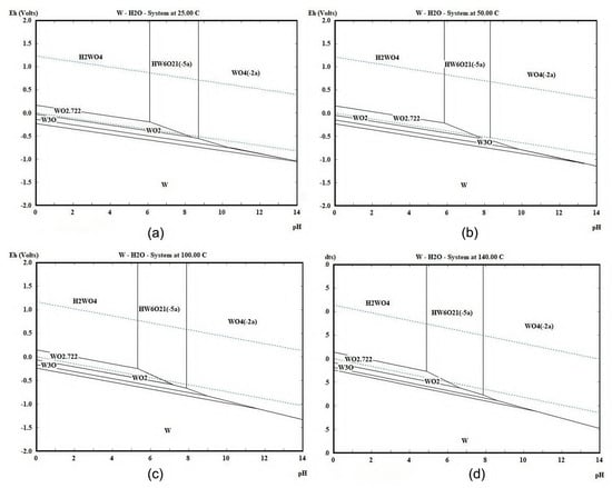 Figure 2. E-pH diagram of the W-H2O system calculated with HSC chemistry software at (a) 25 °C, (b) 50 °C, (c) 100 °C, and (d) 140 °C.