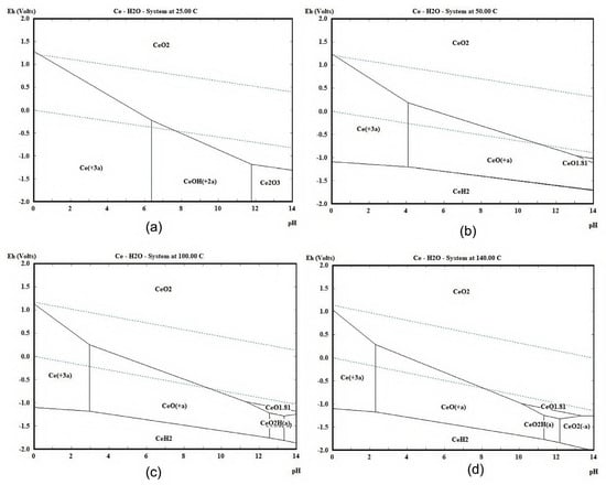 Figure 3. E-pH diagram of the Ce-H2O system calculated with HSC chemistry software at (a) 25 °C, (b) 50 °C, (c) 100 °C, and (d) 140 °C.