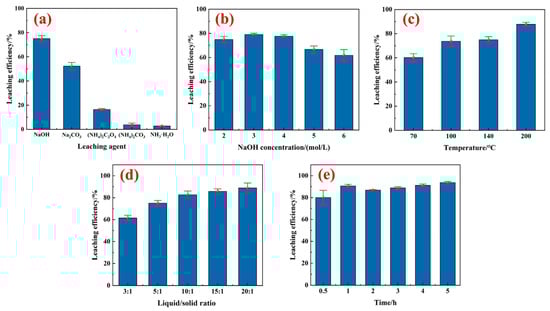 The effects of leach agents on leaching efficiency of tungsten are shown in Figure 4a under the following experimental conditions: a temperature of 140 °C, a liquid/solid ratio of 5:1, and a leaching time of 2 h. From Figure 4a, strong bases such as NaOH and Na2CO3 had a good leaching effect on W, in which the leaching ratio of NaOH could reach 74.94%. Tungsten could hardly be leached due to both leaching efficiencies in weak bases and weak acids of less than 50%. Therefore, optimization conditions were performed with NaOH as the leaching agent in this study.