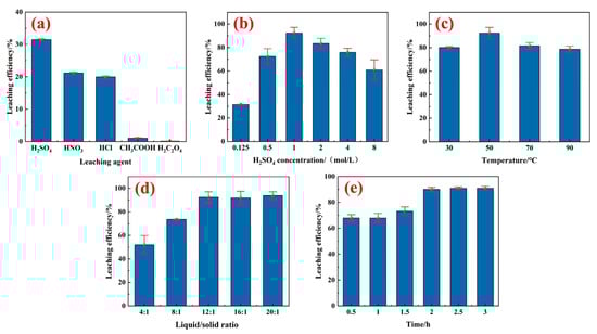 Under identical acidity conditions, six leaching agents—sulfuric acid, nitric acid, hydrochloric acid, acetic acid, and oxalic acid—were used to investigate the leaching efficiency of element Ce. The experimental results are shown in Figure 5a. The three strong acids, sulfuric acid, hydrochloric acid, and nitric acid, demonstrated a certain leaching capacity for Ce, in good agreement with thermodynamic predictions. In contrast, organic acids such as acetic acid and oxalic acid were less effective, possibly due to the poor kinetic characteristics of weak acids. Therefore, sulfuric acid was selected as the leaching agent for Ce.
