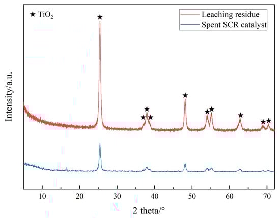 XRD patterns of the spent SCR catalyst and leaching residue are shown in Figure 6. They only exhibited diffraction peaks of TiO2 and did not reveal the presence of other materials such as WO3 or CeO2, indicating that the content of W and Ce was very low or in an amorphous state. On the other hand, the characteristic diffraction peak intensity of TiO2 enhanced after leaching, suggesting an increment in the content of TiO2 post-leaching.
