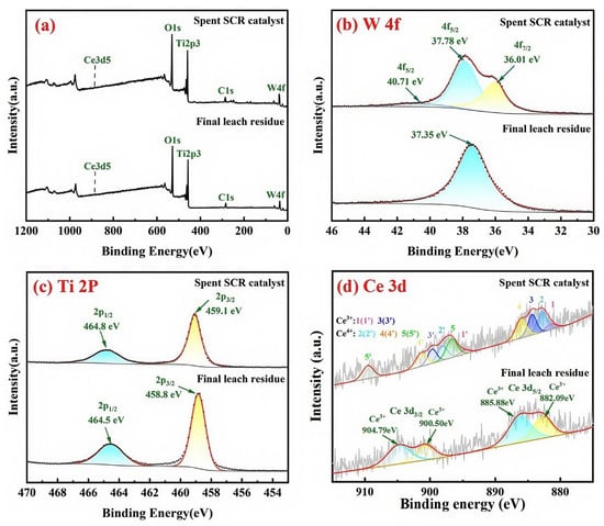 XPS was used to further confirm the elemental composition and valence states. Figure 9a presents the full XPS survey spectrum of the spent catalyst and final leach residue, mainly showing W, Ce, Ti, and O elements. Figure 9b shows the W 4f electronic spectrum of the spent SCR catalyst and final leach residue. The peaks attributed to W 4f5/2 (37.38 eV and 40.71 eV) and W 4f7/2 (36.01 eV) orbitals were observed in the spent SCR catalyst, which corresponded to the oxidation state +6 of W [37,38,39]. Hence, W primarily existed in the form of WO3 in the spent SCR catalysts. However, there was only one peak in the W 4f5/2 electronic spectrum of final leach residue recorded at 37.35 eV, which was shifted towards lower binding energies compared to spent SCR catalyst. But the binding energy of this peak still fell within the range of W6+ oxidation state [39].