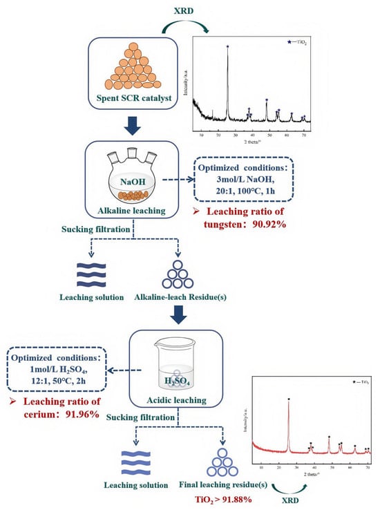 Nitrogen oxides (NOx) are one of the most characteristic atmospheric pollutants emitted from direct combustion of coal in coal-fired power plants [1,2,3]. A substantial emission of NOx can lead to complex environmental pollution issues such as acid rain, photochemical smog, and greenhouse effects. Additionally, these pollutants exert a strong irritating effect on human organs, including eyes and the respiratory tract, posing a significant threat to both environmental safety and public health [4,5]. Selective catalytic reduction (SCR) has become the predominant flue gas denitrification technology due to its favorable reaction temperature, high denitrification efficiency (>90%), excellent reaction selectivity, and well-developed operation of the equipment [6,7]. SCR catalyst is the most crucial component of the selective catalytic reduction denitrification system, in which the active constituents induce the reductant to selectively react with and convert NOx to environmentally benign N2 in the flue gas at a certain temperature [8,9,10]. However, SCR catalyst inevitably undergoes attrition and corrosion caused by alkali metals and arsenic present in the flue dust during prolonged operation, leading to a decrease in the catalytic activity, a reduction in lifespan, and even a decommissioning of the SCR catalyst [11,12,13]. Statistics indicate that approximately 800,000 tons of solid catalysts are consumed globally each year, resulting in about 500,000–700,000 tons of spent catalysts [14]. Spent SCR catalysts have been classified as hazardous waste since 2014. They typically contain 75–90% TiO2, 3–8% WO3/MoO3, and other valuable metals such as vanadium, cerium, or other rare earth metals [15]. If these spent catalysts are not properly disposed of or recycled, they can lead to severe environmental pollution and wasting of resources. Therefore, the recovery of valuable metals from spent SCR catalysts is of significant importance.