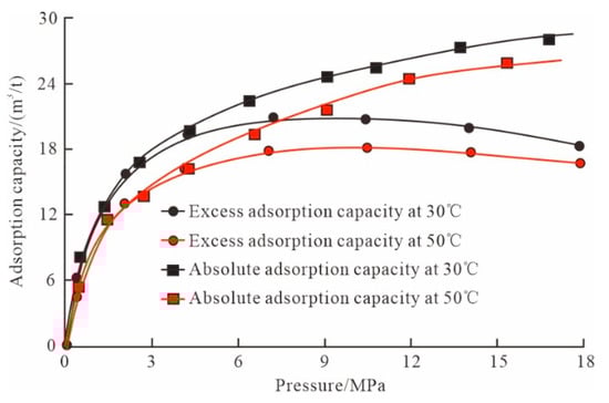 Comparisons of excess adsorption capacity and absolute adsorption capacity (the coal sample was collected from the Dongzhuang Mine in Qinshui Basin, North China).