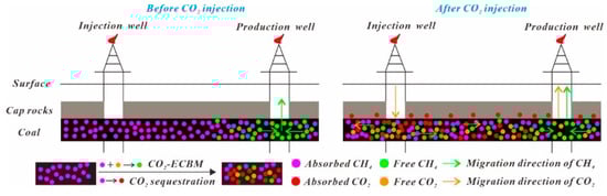 As substantial CBM is reserved in coal, two processes occur when CO2 is injected into coal: (1) Competitive adsorption: As CO2 has a higher boiling point, adsorption affinity of micropores, and smaller molecular diameter [,], coal exhibits a significantly higher adsorption capacity of CO2 than that of CH4, leading to CO2 displacing CH4 adsorbed on the pore surface (Figure 1) [,,,]. The adsorption capacity of CO2 is approximately 2–3 times that of CH4 when the pressure is less than the critical point, but the adsorption capacity ratio of CH4/supercritical CO2 (ScCO2) reaches 1:5 [,,,]. Similar conclusions were drawn from isothermal adsorption experiments [,,,]. (2) Chemical adsorption: CO2 occupies oxygen-containing functional groups and promotes CH4 desorption [,]. These processes mean that CO2 adsorption by coal (CO2 sequestration) is accompanied by CBM desorption (CO2-ECBM, Figure 2).
