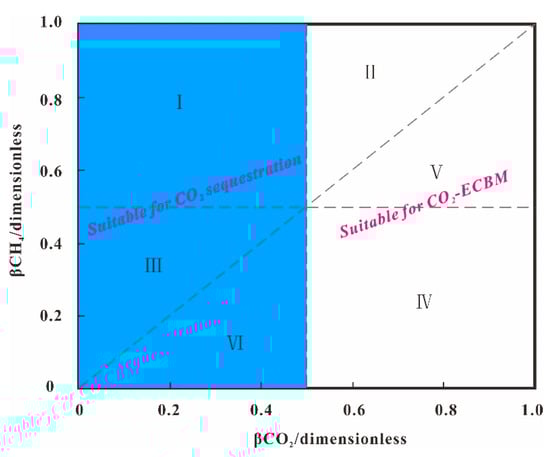 The ultimate goal of the CO2 sequestration process is to adsorb more CO2 in coal, but that of CO2-ECBM is to produce more CH4. Therefore, the applicability of different coal for two processes is diverse. Zheng et al. [] found that the CO2/CH4 adsorption ratio of low rank coal in Xinjiang and high rank coal in Shanxi, China was 5.0 and 2.2, respectively, suggesting that low rank coal is suitable for CO2 sequestration. Similarly, Sun et al. [] concluded that coal with high VL-CO2/VL-CH4 was applicable for CO2 sequestration. To specify the boundaries of coal for CO2 sequestration/CO2-ECBM, Zhang and Liu [] proposed a desorption hysteresis plot (βCH4-βCO2, Figure 3). β indicates the difference between desorption and adsorption, and the value of β ranges from 0 to 1. When β is 1, all adsorption sites can be desorbed, and samples located in regions I/III/VI are more suitable for CO2 sequestration.