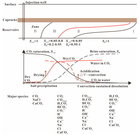 The mineral dissolution–precipitation equilibrium induced by CO2 treatment is related to many conditions, and Kim and Santamarina [] divided the area around the CO2 injection well into four distinct zones (Figure 5). Zone I was unaffected by CO2 injection, and Zone II was dominated by acidified brine with more mineral dissolution than precipitation. In Zone III, the ion concentration of the brine increased, and salt precipitation may occur. A sustained influx of “dry” CO2 into Zone IV first displaced the brine and then dried out the residual brine, leading to salt precipitation.