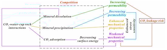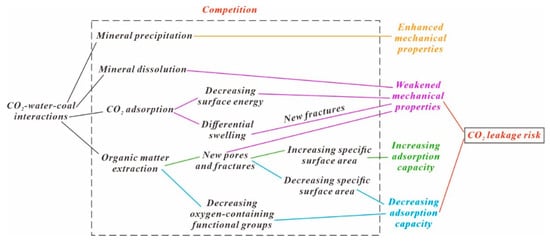 The rock properties vary greatly when changing chemical compositions, and the integrity of caprocks is consistently a critical issue for CO2 sequestration. An increase in the permeability of caprocks also leads to the CO2 leakage risk. As the caprocks of coal are generally shale, siltstone, and sandstone, the changes in the properties of these rocks after CO2 treatment indicate the integrity of caprocks for CO2 sequestration in coal. Variations in mechanical properties and permeability induced by CO2–water interaction depend on the competition of multiple effects (Figure 6): (1) Weakened mechanical properties and decreased permeability due to CO2 adsorption [,,,]. (2) Weakened mechanical properties due to moisture loss in pores []. (3) Weakened mechanical properties and increased permeability induced by mineral dissolution, and enhanced mechanical strength and decreased permeability due to precipitation [,,,,,,,,]. (4) Increased stress sensitivity due to weakened mechanical properties [,].