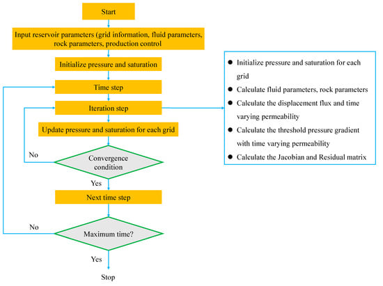 The solution procedure of the proposed model is similar to that of the traditional black oil model []. The full calculation process is shown in Figure 3, and the numerical simulator is compiled by using Fortran language. Compared to traditional black oil model, some improvement is made in the program considering the permeability time variation and non-Darcy flow effect. During each iteration, the displacement flux is computed for every grid, followed by recalculation of the time-varying permeability and grid transmissibility to accurately capture permeability evolution dynamics. Moreover, the water-flooding-dependent threshold pressure gradient is dynamically calculated based on the time-varying permeability to more accurately capture the non-Darcy flow characteristics. Through this integrated computational approach, an advanced simulator that effectively captures the coupled physics of time-dependent permeability variations and non-Darcy flow behavior is successfully developed, thereby providing a robust tool for heavy oil reservoir performance prediction.