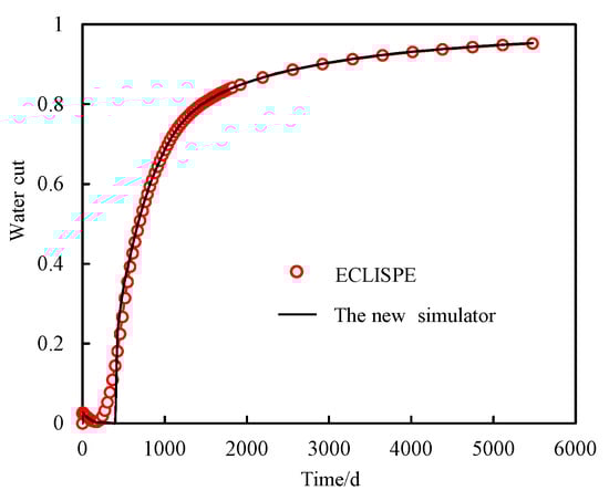 Figure 4 compares the water cut profiles simulated by both our proposed model and the commercial ECLIPSE 2018 simulator. The simulation results demonstrate excellent agreement between both models. It demonstrates the accuracy and reliability of the new proposed numerical simulator.