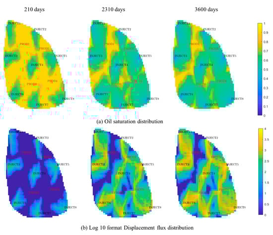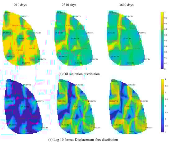 Oil saturation (a) and displacement flux (b) distribution of model.