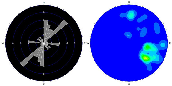 Rose Diagram of F02 Fault Joint Orientations and Equal-Density Plot of Dip Angles.