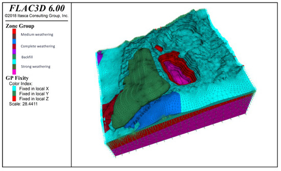 Local mesh refinement was employed to reduce cell count and boost computational efficiency without sacrificing accuracy. This produced denser tetrahedral elements around the pit interior and at stratigraphic interfaces, with coarser elements in the outer rock mass. The final mesh comprises 218,087 nodes and 630,359 elements (see Figure 6 for mesh layout and boundary conditions). Normal displacement constraints were applied: x-direction fixed on the lateral faces, y-direction fixed on the front and rear faces, and z-direction fixed only at the model base.