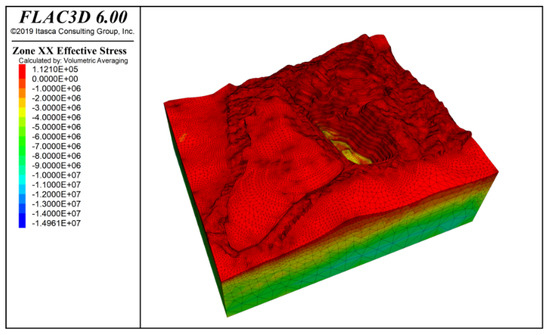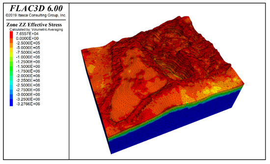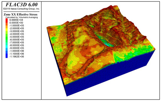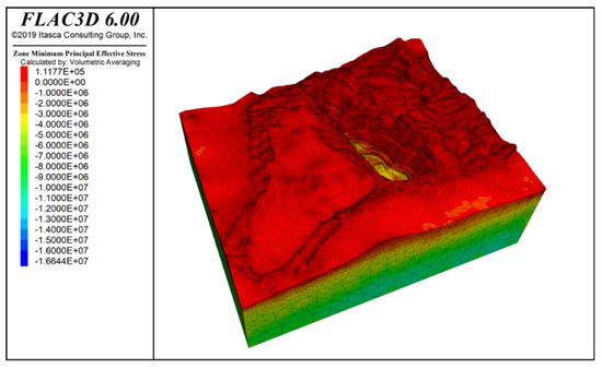 To assess the effects of blasting vibration on slope behavior, we simulated the stress and strain under combined self-weight, groundwater, and blasting loads and compared them to the baseline case without blasting. Figure 12 and Figure 13 present the vertical stress and maximum effective stress contours under these conditions. (In FLAC3D, principal stresses are ranked by absolute magnitude, so the label “Minimum Principal Stress” denotes the greatest compressive stress.) The overall stress field remains vertically dominated with a clear stratified pattern, and the peak effective stress (−1.196 MPa) still occurs at the deepest part of the slope. Notably, blasting produces tensile stresses concentrated at both the slope crest and the waste dump crest, indicating these areas are especially susceptible to deformation from horizontal vibration.