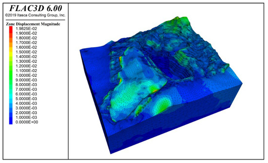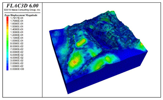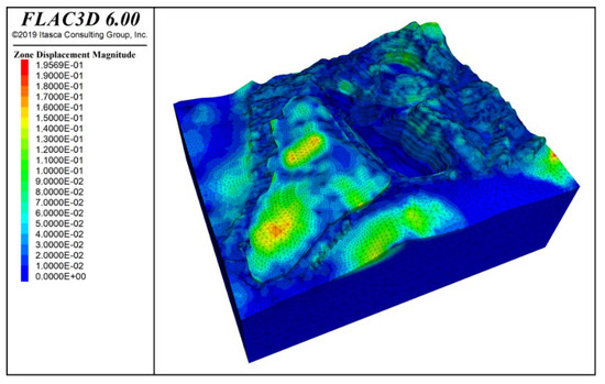 Under the combined effect of rock mass self-weight, groundwater, and blasting vibration, the deformation contour results of the slope are shown in Figure 16. From the figure, it can be observed that the potential sliding areas mainly occur at the slope crest, with a concentration in Zone F and the slope crest in Zone I. Under the self-weight influence, the maximum displacement of the slope reaches 195.7 mm, with the maximum deformation occurring at the bottom and upper parts of the waste dump and in the F zone of the mining area slope divisions. After the addition of the waste dump, the displacement of the F zone slope significantly increased, concentrated in the lower half of the waste dump and the northern section near the mining area. The deformation increased from 2.38 mm to 195.69 mm. However, the deformation range in other areas of the mining area did not exceed 10 mm.