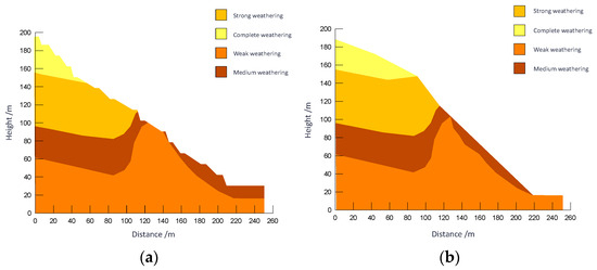 - The open-pit slope is divided into eight zones, with the predominant failure modes being circular and compound failures. Based on the degree of weathering, the rocks are classified into four types: slightly weathered, moderately weathered, heavily weathered, and fully weathered. With increasing weathering, parameters such as rock density and strength gradually decline.