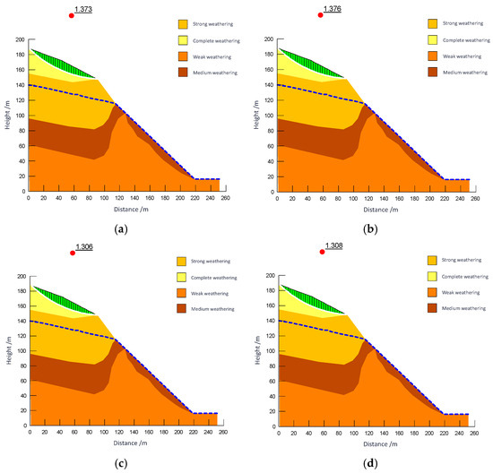Local stability analysis and calculation results after optimization of a profile in Zone F. (a) Safety factor of bishop method 1.373; (b) Safety factor of M-P method 1.376; (c) Safety factor of bishop method 1.306; (d) Safety factor of M-P method 1.308.
