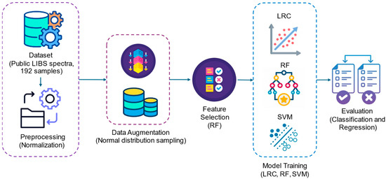 The overall methodology adopted in this study is summarized in Figure 1. It consists of six main stages: (i) dataset acquisition using publicly available LIBS spectra of mulberry leaves, (ii) preprocessing through normalization, (iii) data augmentation using normal distribution sampling, (iv) feature selection based on random forest importance values, (v) model training using three machine learning algorithms (LRC, RF, and SVM), and (vi) performance evaluation through classification and regression metrics.